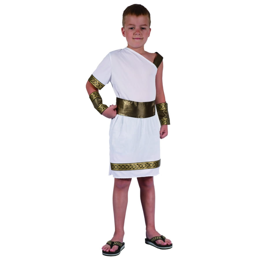 Mettez cette toge blanche et dorée asymétrique pour enfant au vôtre et ce dernier se transformera en un parfait romain.