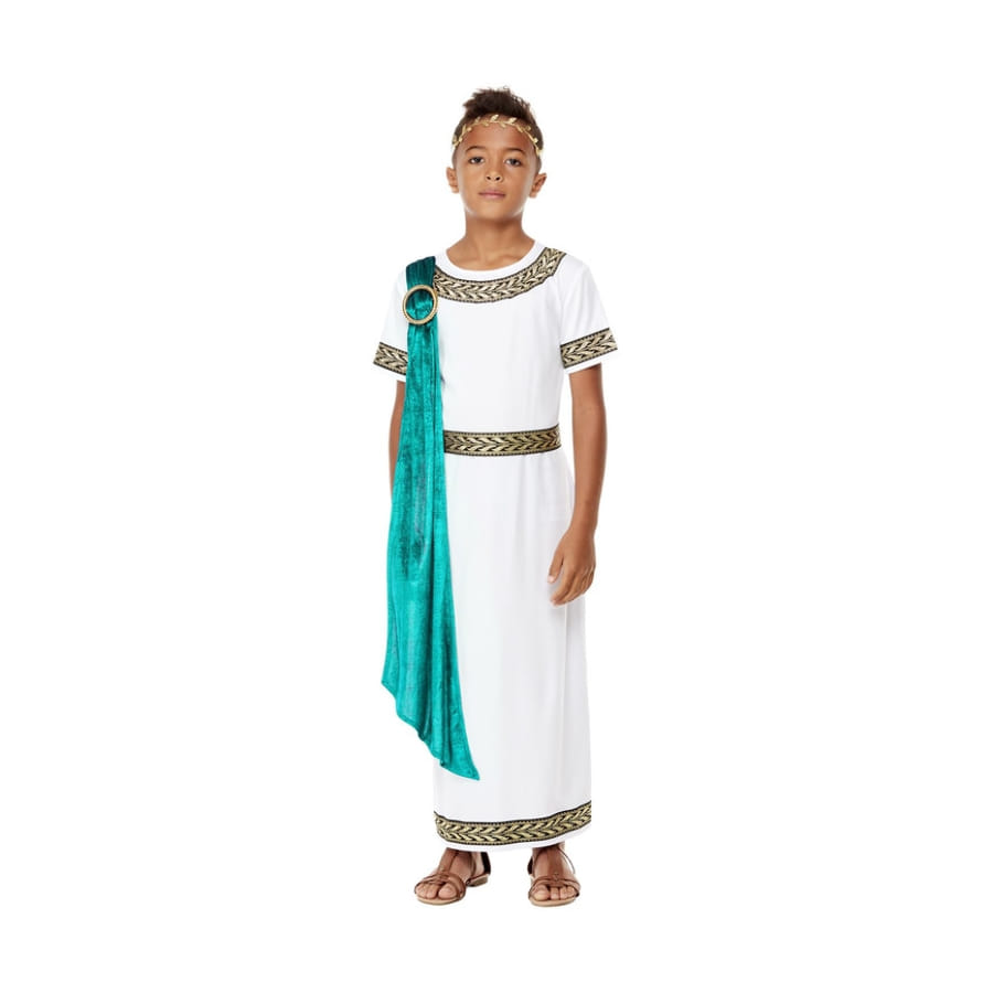 La toge pour petit romain verte et blanche révélera au grand jour la noblesse et la royauté qui sommeille en votre enfant, le temps d'une fête à thème.
