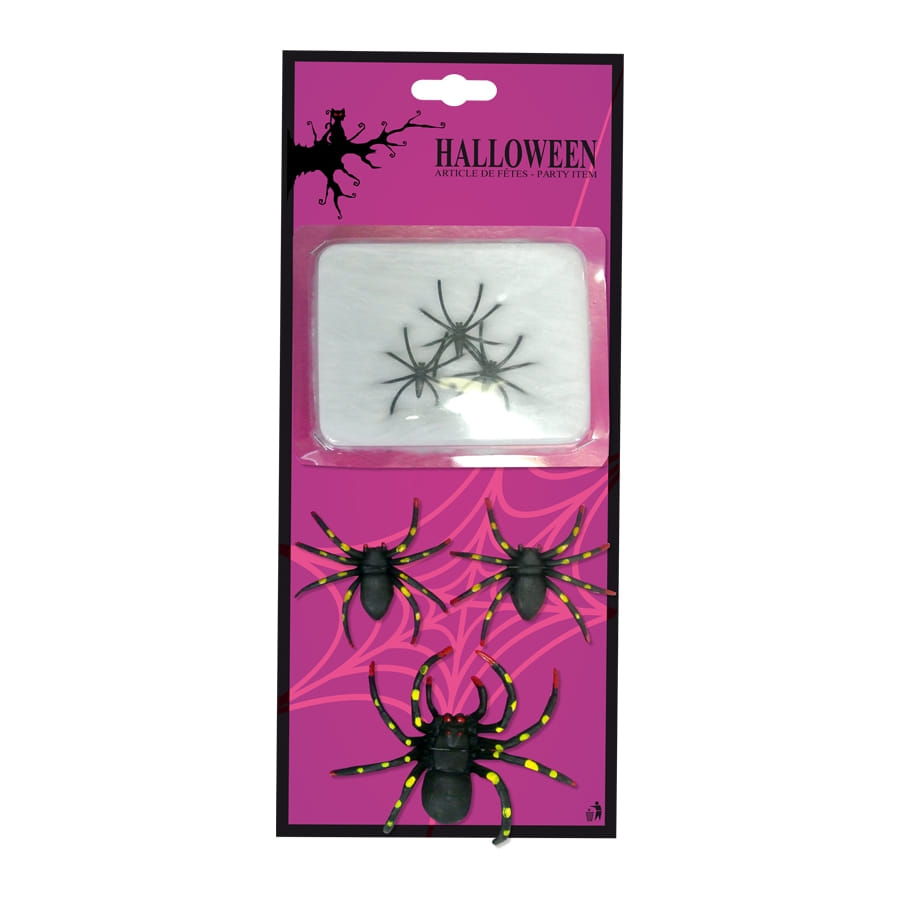 Sachet de décoration d'Halloween contenant de la toile d'araignée blanche et 6 araignées sous blister. Ces dernières sont de couleur noire, avec des pâtes à rayures jaunes. La toile d'araignée pèse 10 grammes. Ornez votre maison, votre salle de fête ou votre décor de spectacle avec ces petits accessoires.