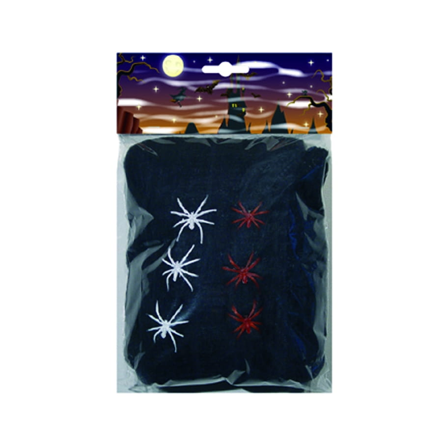 Toiles d'araignées de couleur noire avec 5 araignées, vendues en sachet de 100 grammes. Avec ces toiles, vous rendrez votre décor d'Halloween encore plus réaliste.