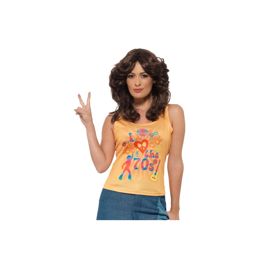 Mettez-vous à votre aise lors d'une fête à thème hippie. Si vous aimez le style décontracté, vous allez adorer ce top I Love the 70s, pour femme. Il s'agit d'un petit haut de couleur jaune, sans manches, léger et confortable. Le devant est décoré d'un magnifique imprimé "I Love the 70s" accompagné de quelques motifs sympas.