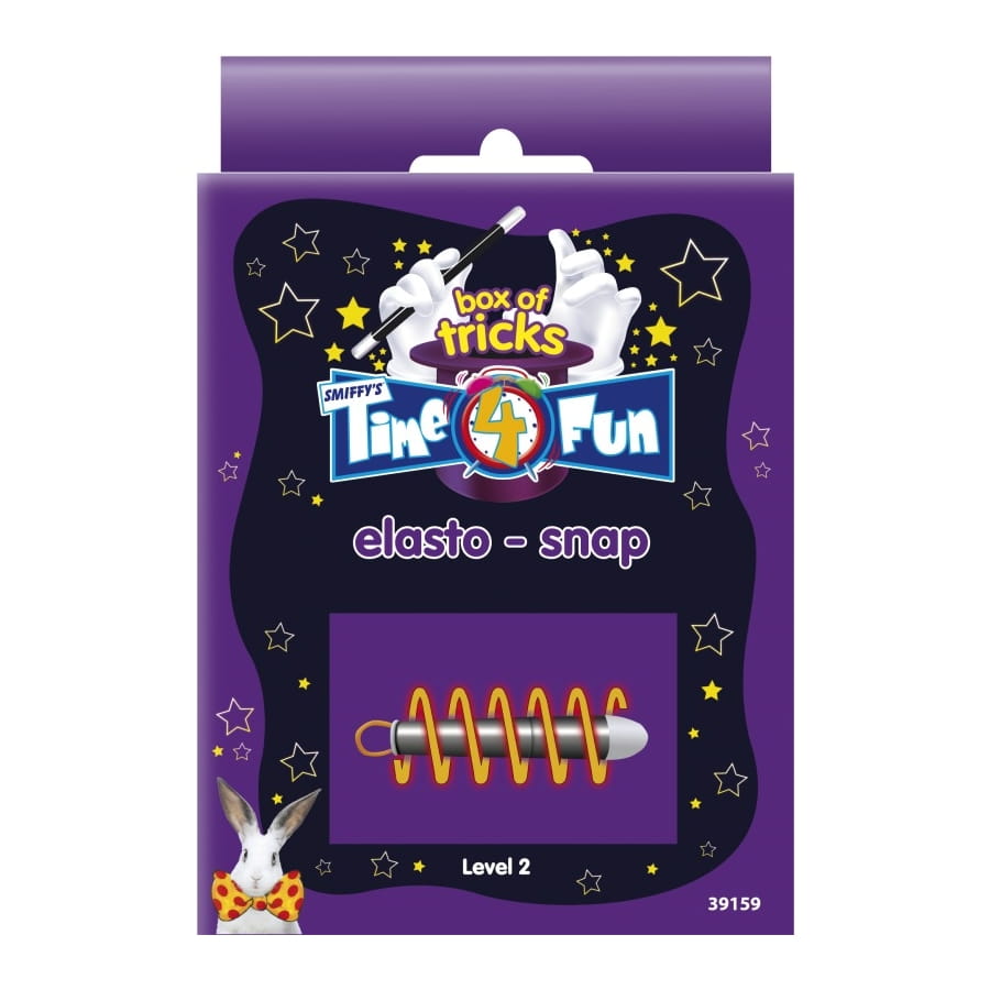 Boîte "Time 4 Fun" contenant les accessoires nécessaires pour un tour de magie de niveau 2 incluant un élastique magique. Il vous apprendra comment crocheter l'élastique en utilisant l'épingle. C'est un tour simple, mais qui laissera ébahis vos amis et proches. Il ne convient pas aux enfants de moins de 3 ans.