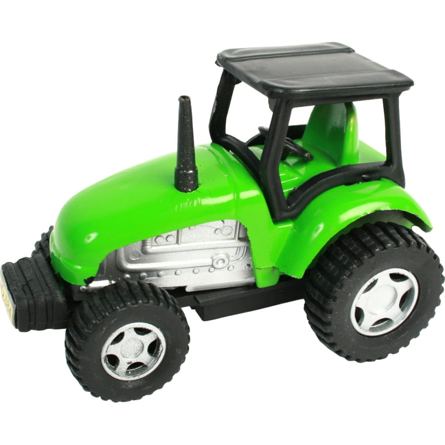 Tracteur à rétrofriction de 10 centimètres de couleur noire et verte. Au moment de passer la commande, vous ne pourrez choisir ni le modèle ni la couleur. Vous le recevrez comme présenté. Avec le système à rétrofriction, il suffit de faire reculer le tracteur et de le relâcher pour qu'il avance.