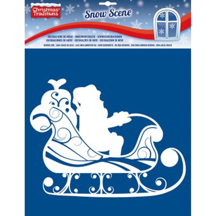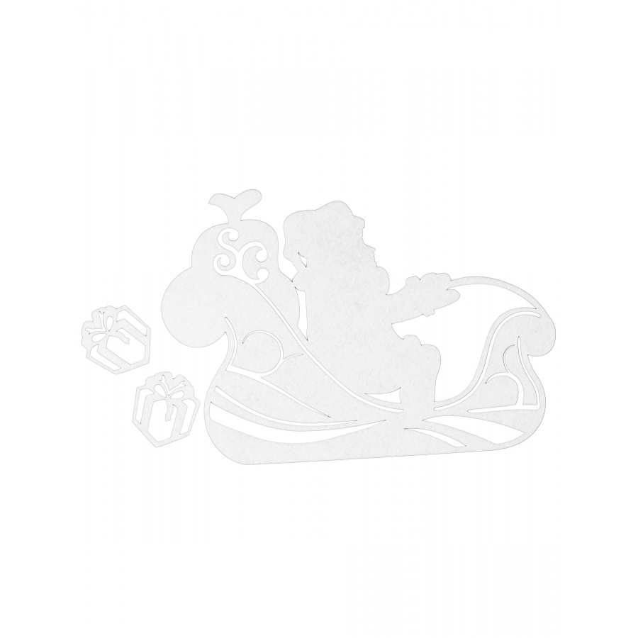 Il est question ici d'une décoration autoadhésive de 5 x 5 cm conçue pour être collée à une fenêtre et composée d'un Père Noël sur traineau et de 2 petits cadeaux.