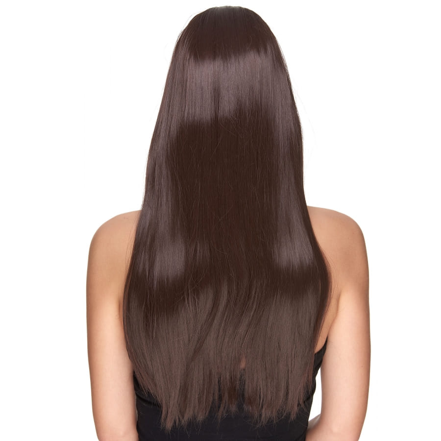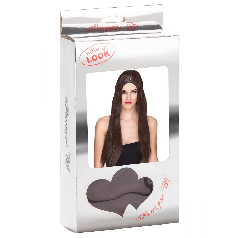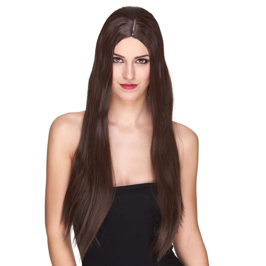 La perruque de qualité supérieure est une coiffure de très longues mèches brunes lissées et très soyeuses.