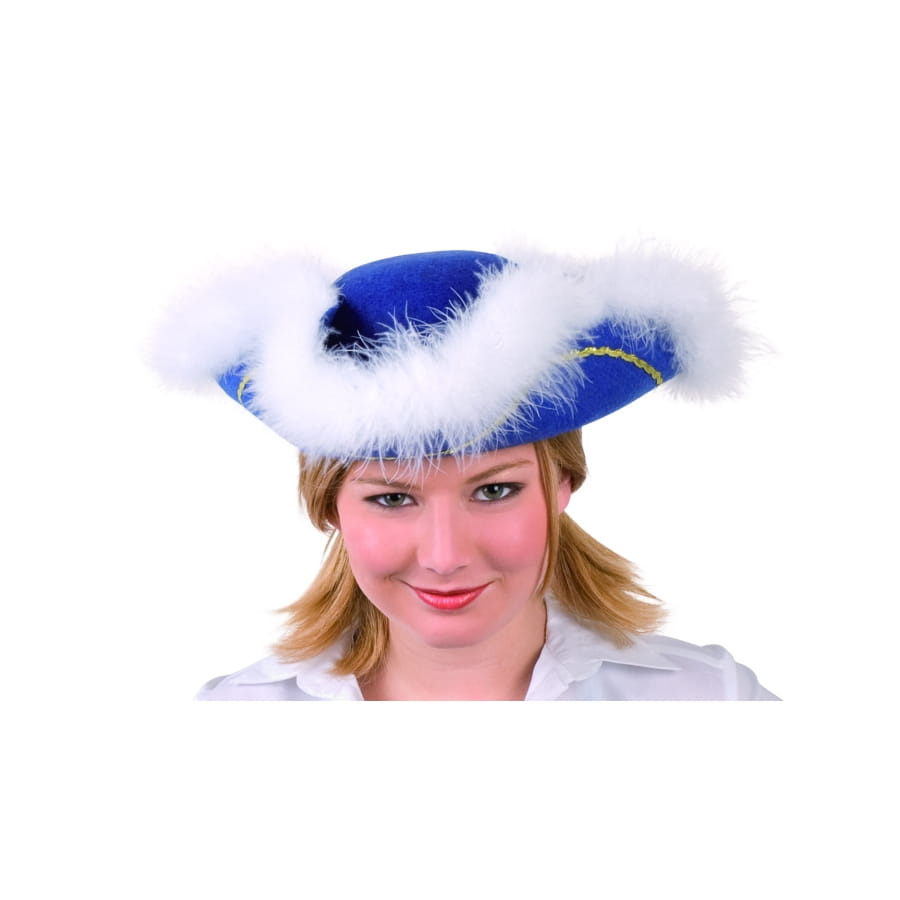 Alors pirate ou mousquetaire? Au choix, ce tricorne bleu orné de marabout blanc et de filaments dorés est parfait pour les deux personnages. Libre à vous de choisir.