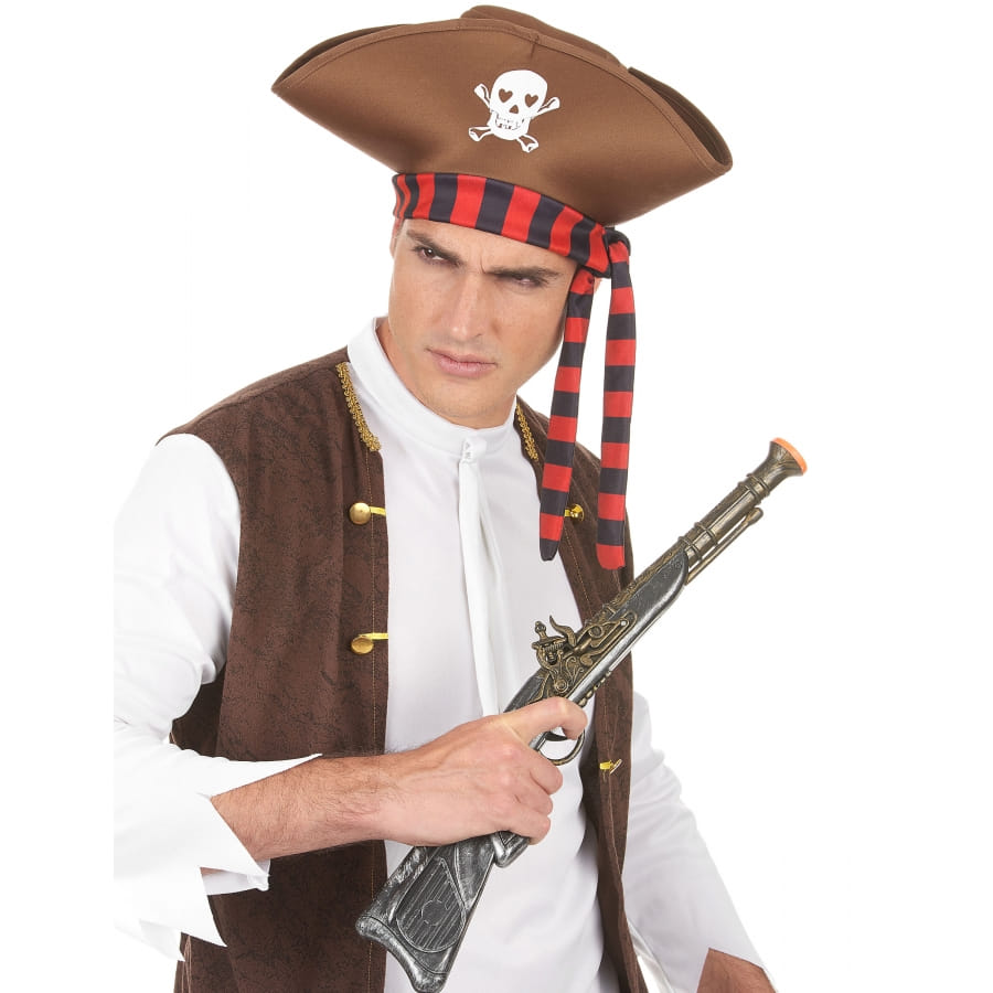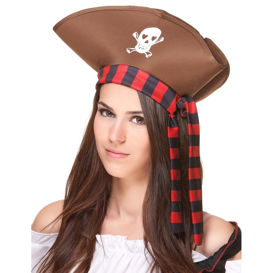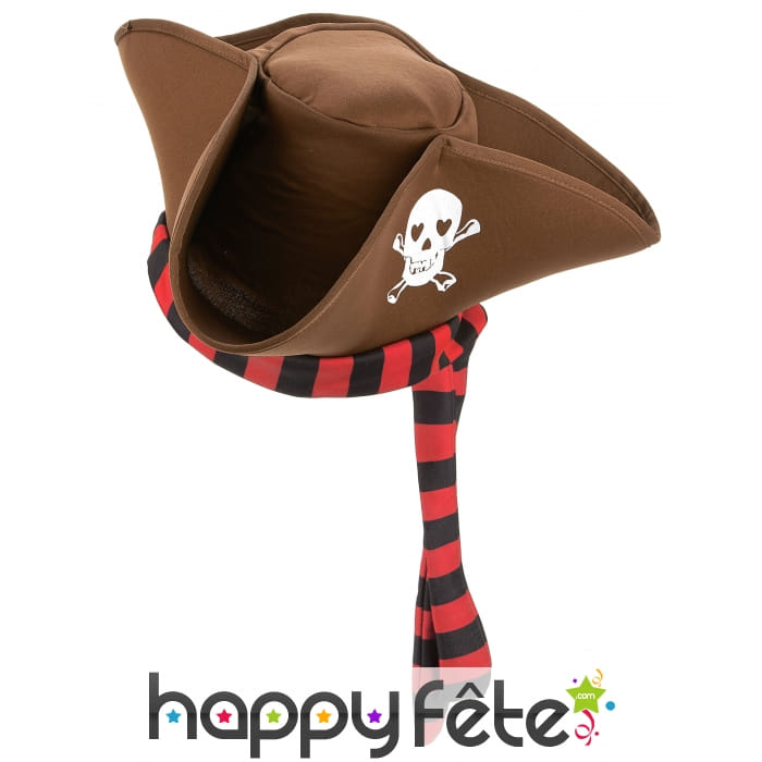 Ce Tricorne marron de pirate avec bandeau noir rouge est un accessoire idéal pour compléter un déguisement de pirate.