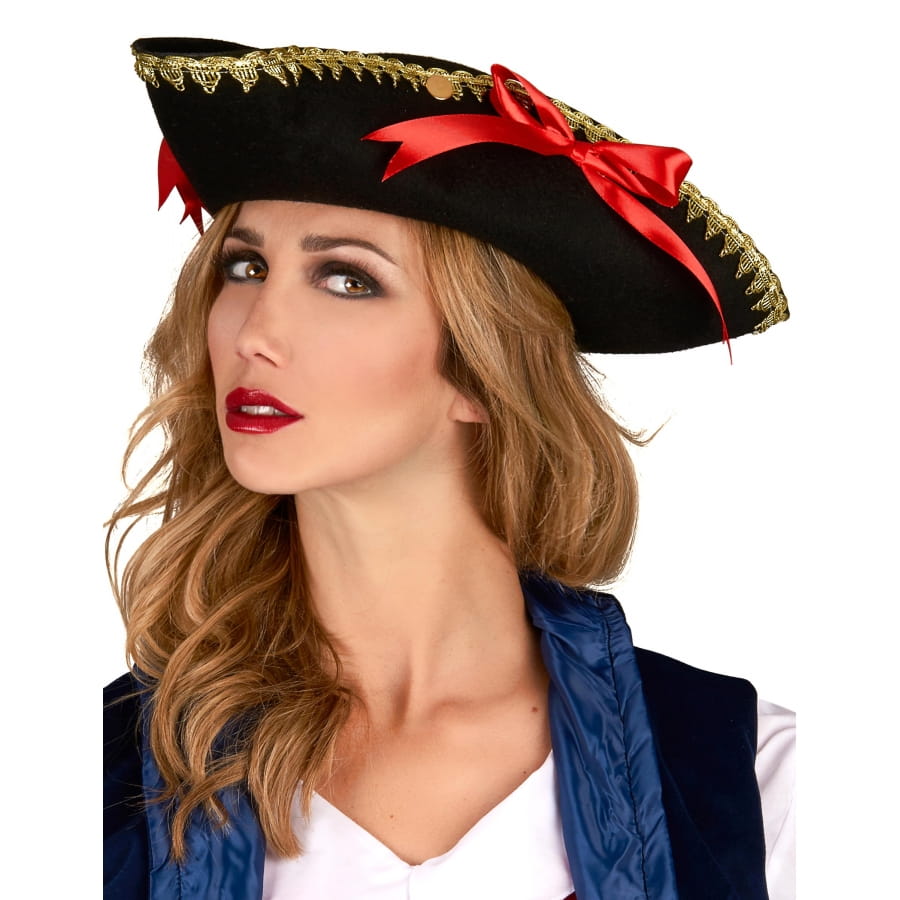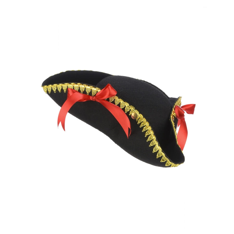 Ce beau tricorne noir avec bord doré et noeud rouge pour adulte accessoirisera parfaitement votre déguisement de pirate.