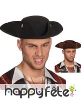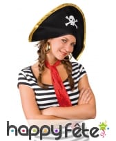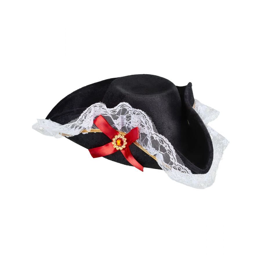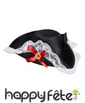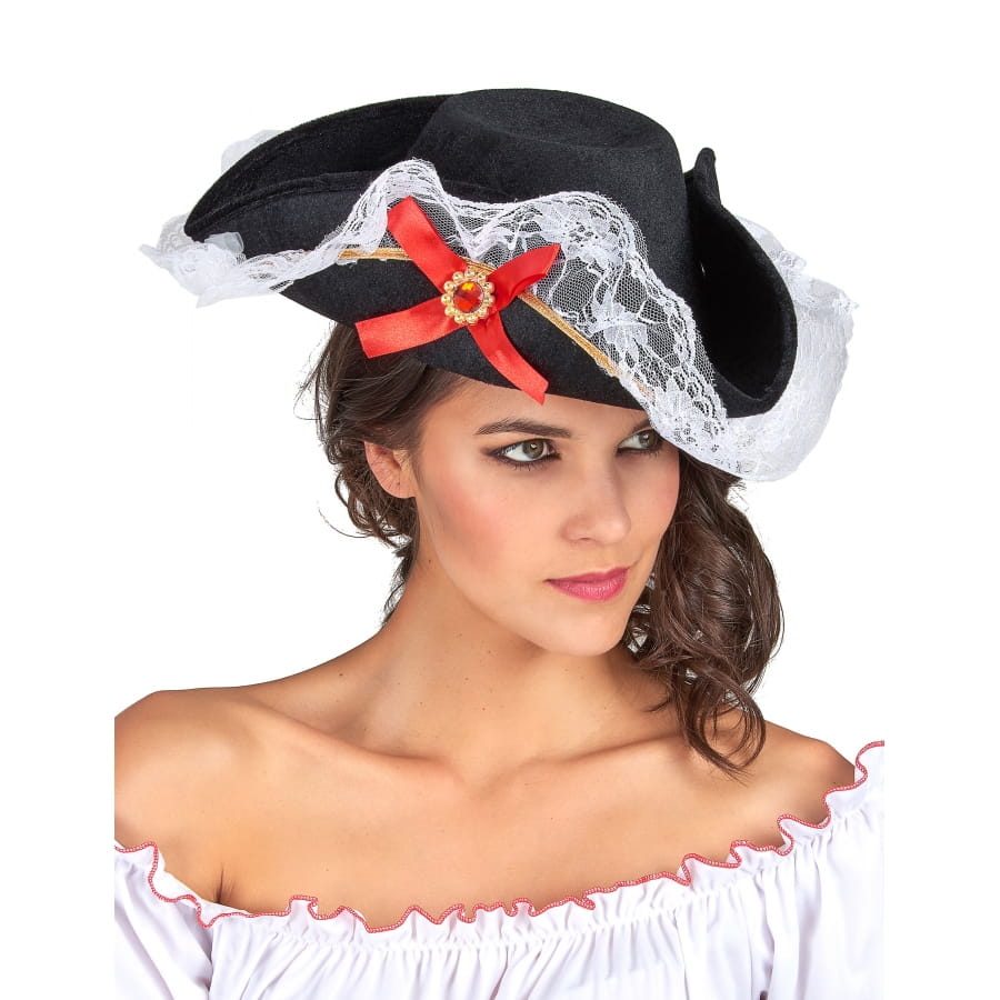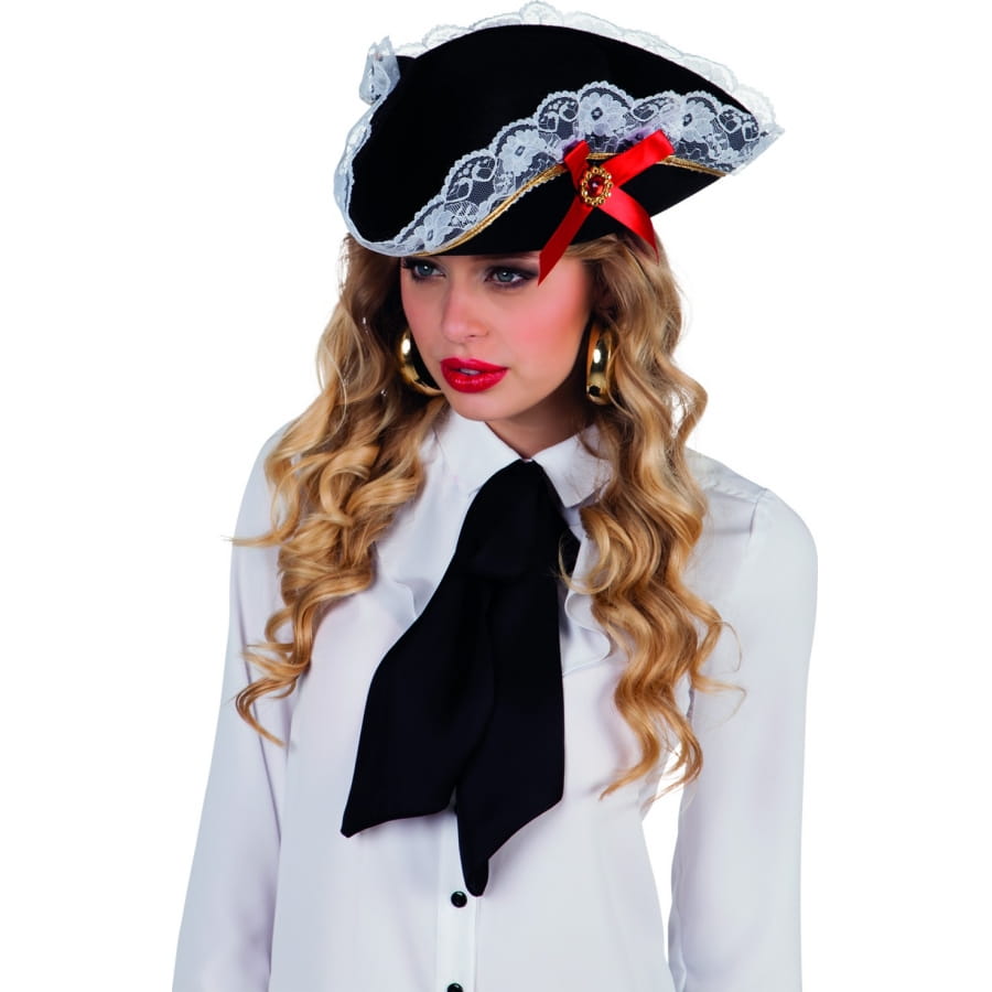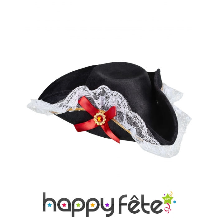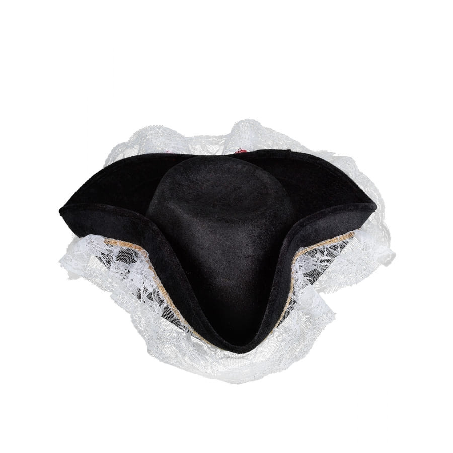 Imposez-vous comme membre de l'équipage avec ce superbe modèle tricorne noir bordé de dentelle blanche.