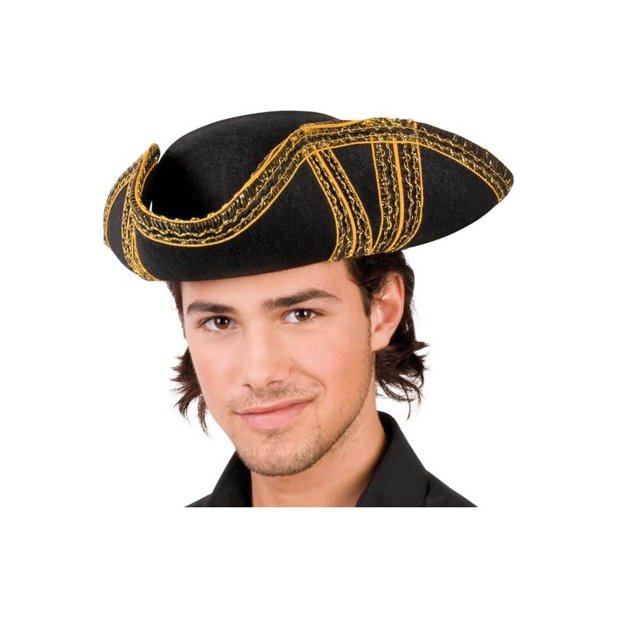 Tricorne noir et doré galonné en feutrine. Lors de la commande, il vous sera impossible de choisir le modèle ou la couleur de l'accessoire. Vous recevrez le chapeau comme présenté. Il est idéal pour un déguisement de pirate.