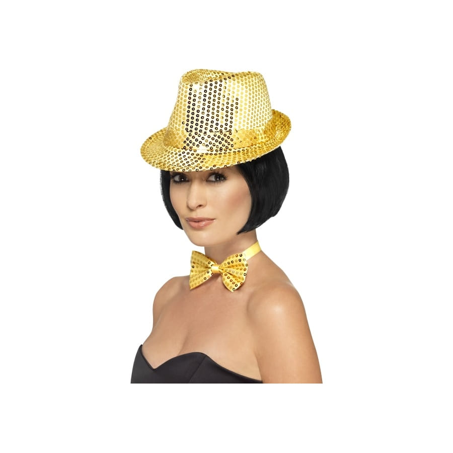 Les chapeaux de type trilby ont la classe. Et ce n'est pas celui-ci, un trilby doré à sequin qui va démentir cela. Il est rempli de sequins de couleur doré, parfait pour un déguisement disco ou un déguisement bling bling. Il peut être porté par un homme ou une femme. N'hésitez pas à rechercher un déguisement disco sur Happyfete pour aller avec.
