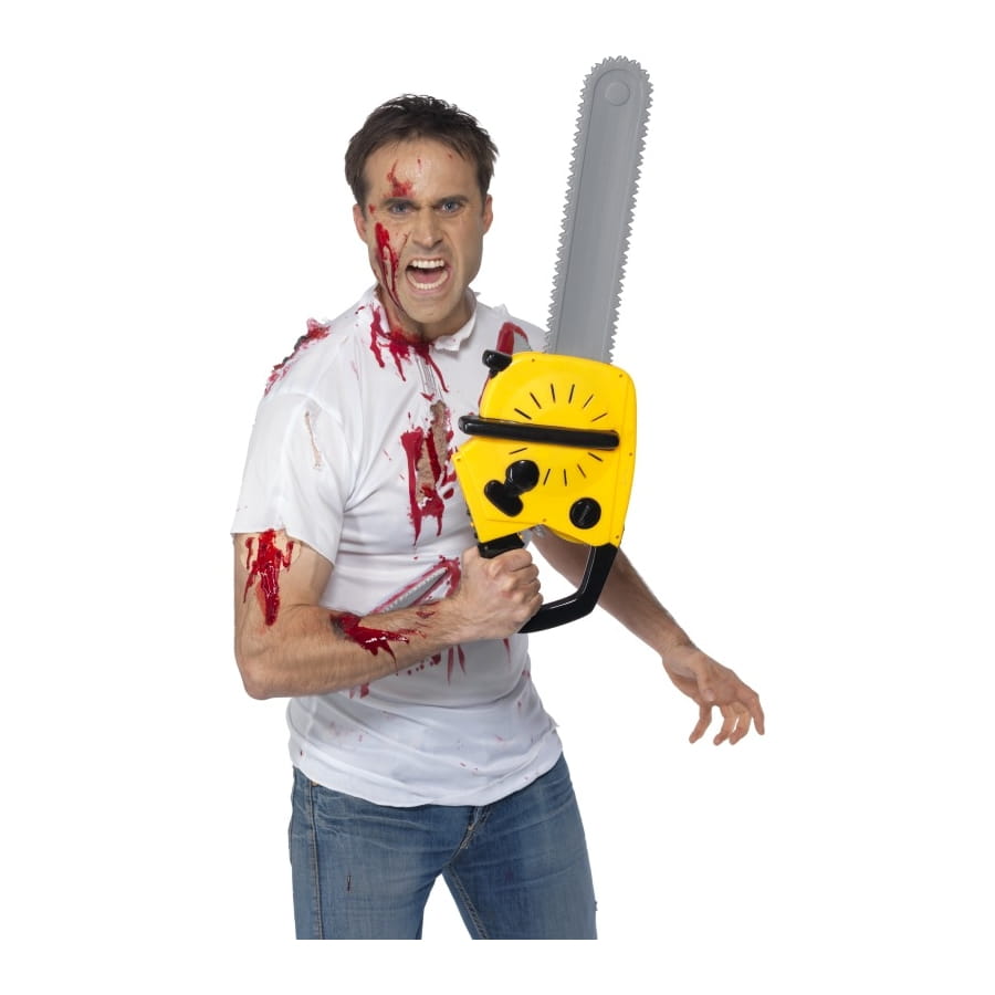 Tronçonneuse avec son, de couleur jaune, grise et noire, pour homme. Cet accessoire complètera parfaitement un déguisement de tueur en série pour une soirée d'Halloween ou pour une fête basée sur le thème de l'horreur.
