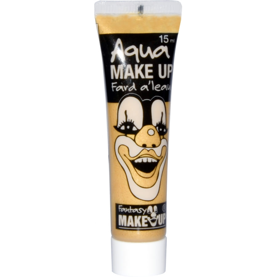 Tube de maquillage de couleur or, de la marque AquaColor. Ce tube contient 15 millilitres de fard et permet de composer environ 10 visages. Appliquez-le directement sur votre peau et enlevez ensuite le tout avec de l'eau et du savon. Utilisez un pinceau pour les détails. Superposez les couleurs si vous le souhaitez.