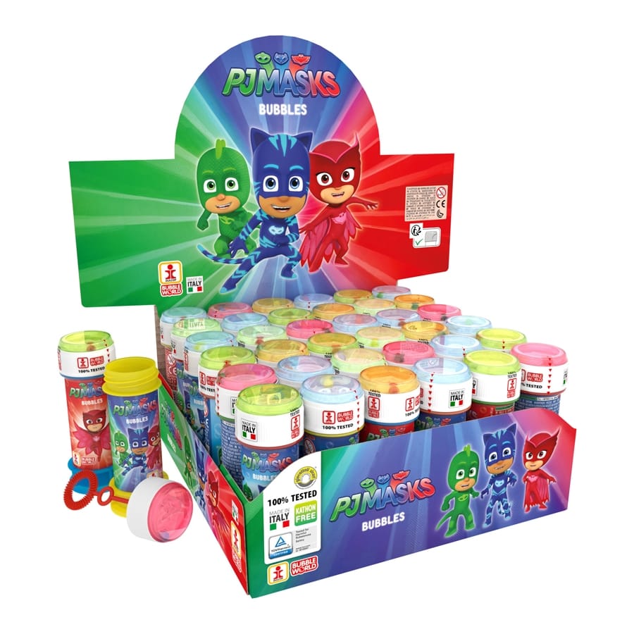 Ce tube de bulle de savon est décoré sur le thème du célèbre dessin animé pyjamask (ou pyjamasque).