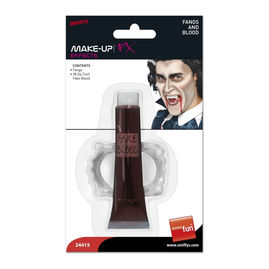 Tube de sang de couleur rouge, pour le visage. Le tube contient 25 ml de sang ainsi qu'un dentier blanc en plastique de vampire. Il est idéal pour un déguisement ensanglanté à l'occasion d'Halloween, tel que celui de vampire.