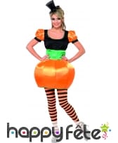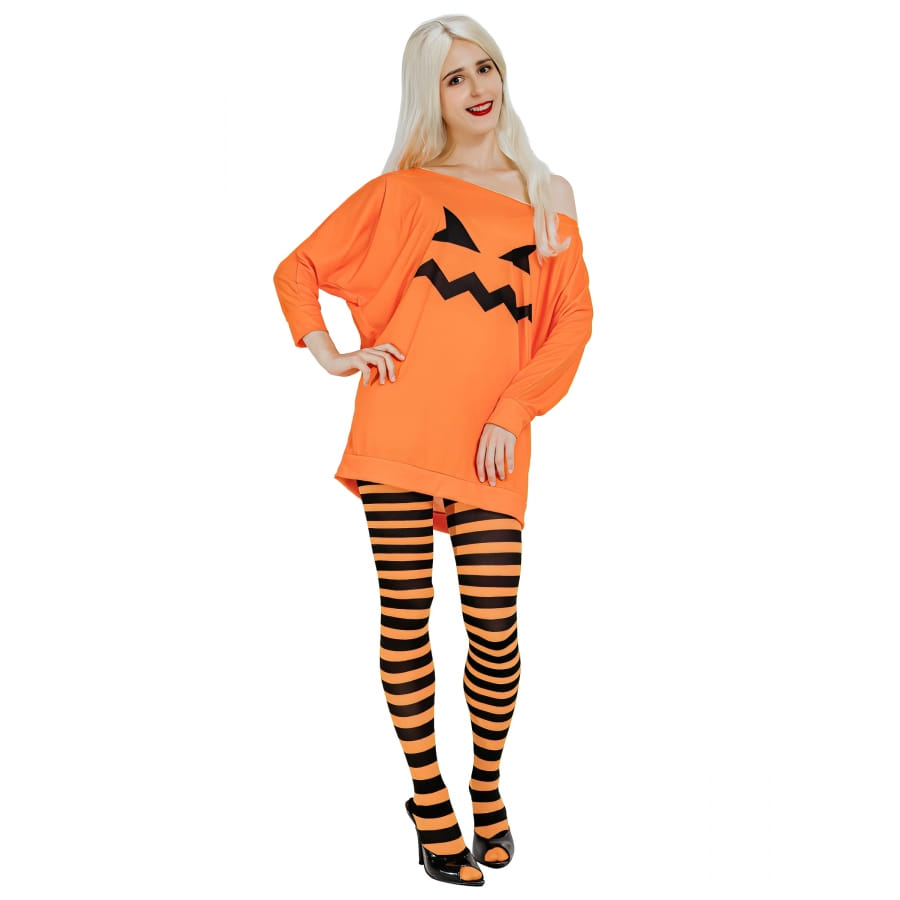 Pour ajouter une touche de fantaisie supplémentaire à votre déguisement, pensez à accessoiriser votre tunique citrouille avec un collant noir ou raillé (comme sur la photo) et des chaussures à talons pour un look chic et élégant, ou avec des baskets pour un style plus décontracté. Et n'oubliez pas le maquillage orange et noir pour parfaire votre déguisement !