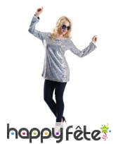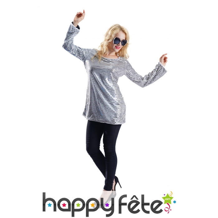 Cette tunique est entièrement recouverte de sequins argentés, et met en valeur le style bling-bling des années disco.