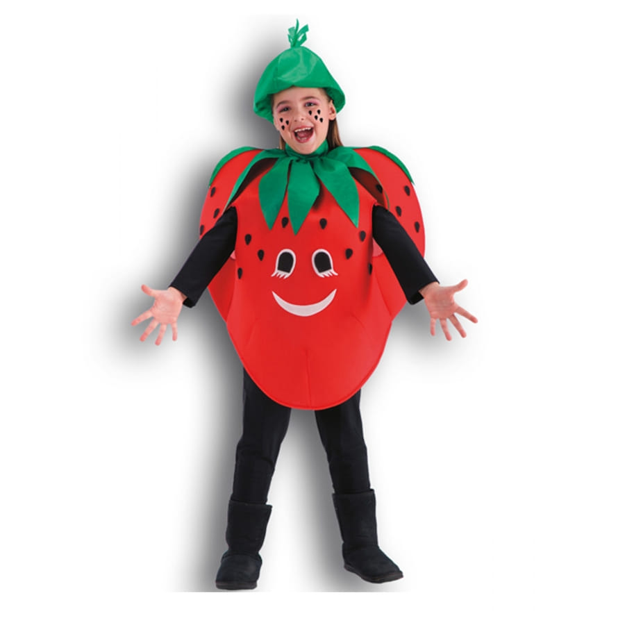 La tunique représente une fraise rouge qui affiche un visage souriant sur sa partie avant ainsi que des petits points noirs.