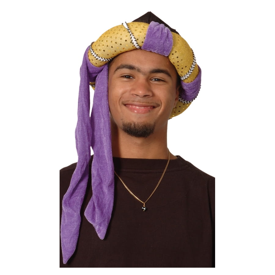 Rappelez-vous les aventures des 1001 nuits avec ce turban arabe violet et doré.