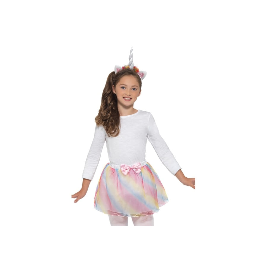 Les petites filles sont fascinées par les licornes. Faites plaisir à votre jeune demoiselle en lui offrant cet ensemble tutu et serre-tête de licorne pour enfant. Comme dans un conte de fée, elle pourra réaliser ses rêves les plus fous ! Le tutu est orné d'un joli petit noeud rose et il présente les couleurs de l'arc en ciel dans des tons clairs. Le serre-tête est équipé de deux petites oreilles roses et blanches et d'une corne torsadée au milieu.