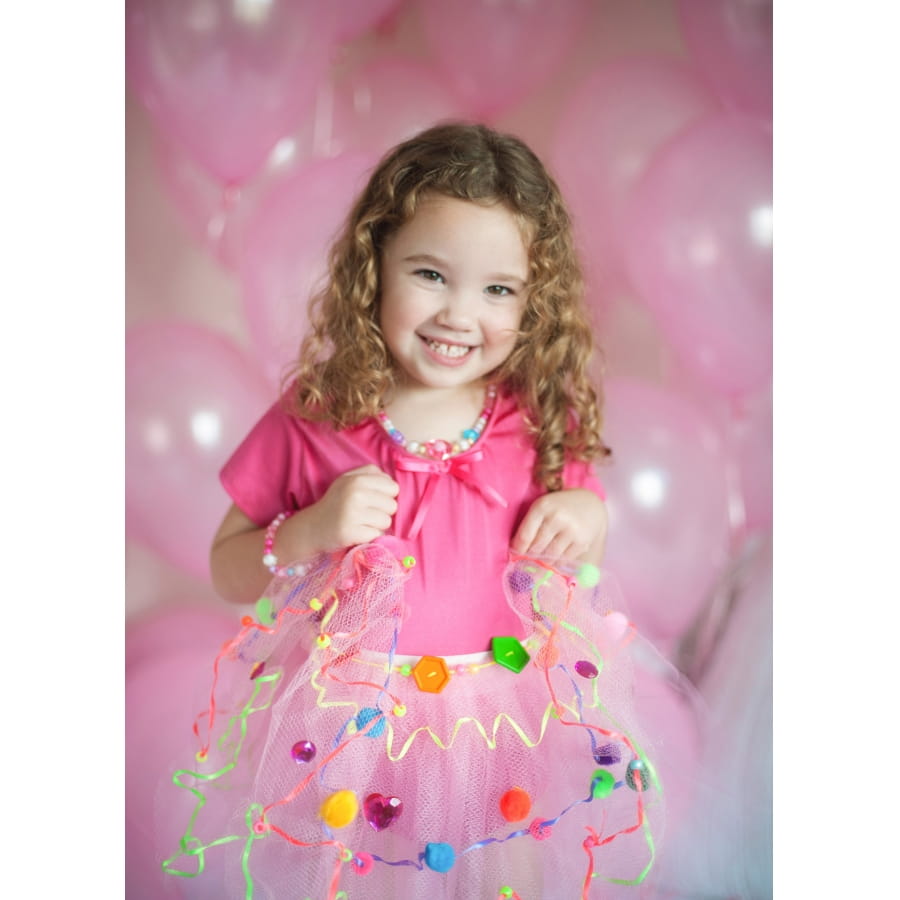 Il est question d'un kit comprenant un tutu rose fait de plusieurs couches de tissus qui se croisent, ainsi que de nombreuses décorations multicolores qui vous permettront de le personnaliser selon vos gouts et votre créativité.