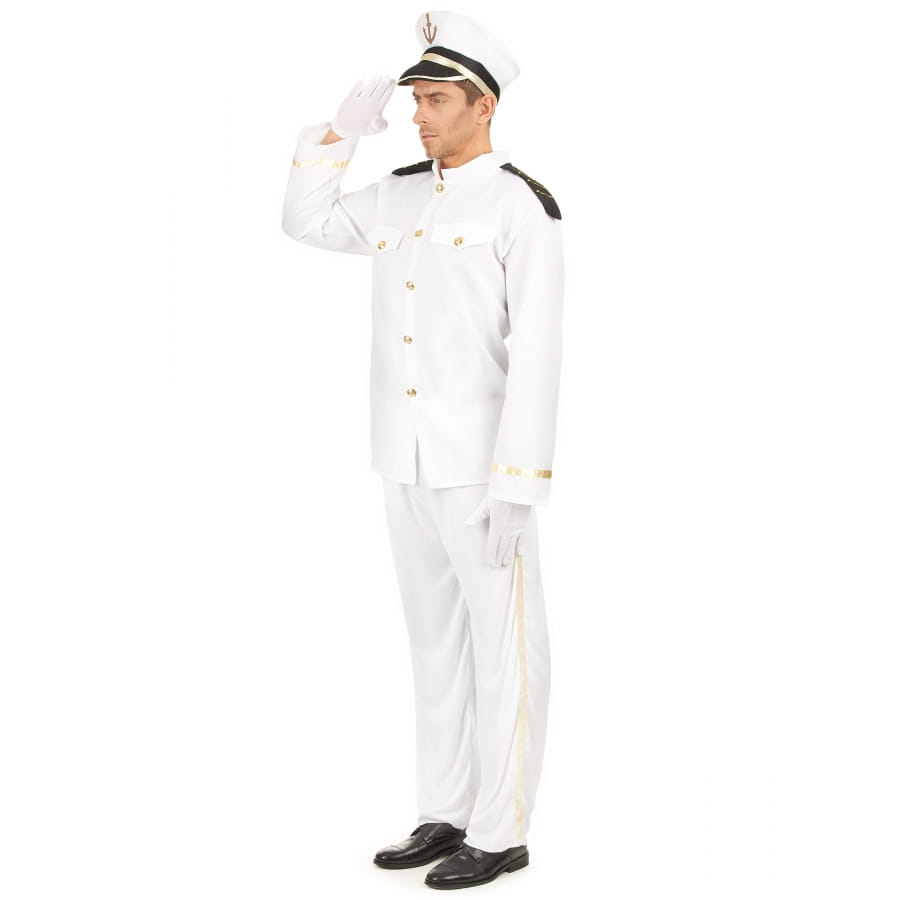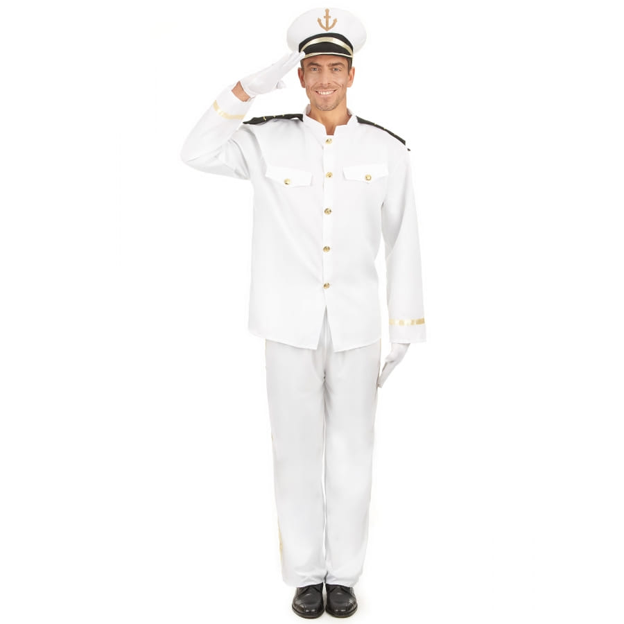 Tout le monde à son poste, le capitaine arrive ! Emparez-vous sans plus attendre de cet uniforme blanc capitaine de la marine. Il est composé d'une veste à manches longues de couleur blanche. Elle est agrémentée de deux fausses poches sur le devant, ainsi que de deux épaulettes noires avec des coutures dorées, comme sur un véritable uniforme de marine. L'article comporte également un pantalon de couleur blanche avec une bande dorée sur chaque jambe. Chaque bande est disposée sur toute la longueur du pantalon. Le pantalon est élastique au niveau de la taille. Une casquette blanche avec des lignes noires et dorées et un motif insigne de la marine vous est fournie en guise d'accessoire.