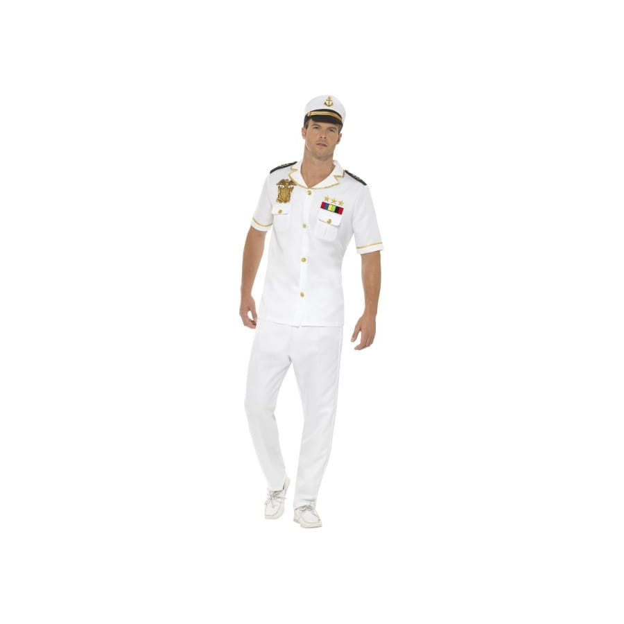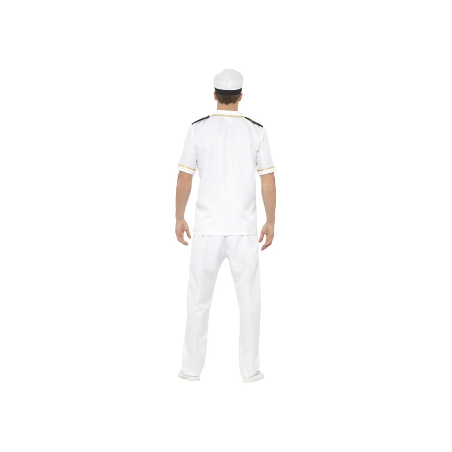 Un véritable chef de l'expédition maritime se doit d'avoir une tenue impeccable. Vous ne manquerez pas d'originalité en incarnant ce personnage lors d'une soirée déguisée. Messieurs, êtes-vous prêt à vaguer sur les mers et océans dans cet uniforme blanc de capitaine de la marine ? Vous serez revêtu d'une superbe chemise blanche à manches courtes. Elle est agrémentée de quelques liserés dorés et les boutons de devant sont également de couleur or. Ce haut est complété par un pantalon blanc classique. Côté accessoire, vous disposerez d'une casquette de capitaine, de couleur blanche, à visière noire. Elle présente un motif insigne de la marine de couleur dorée sur le devant.