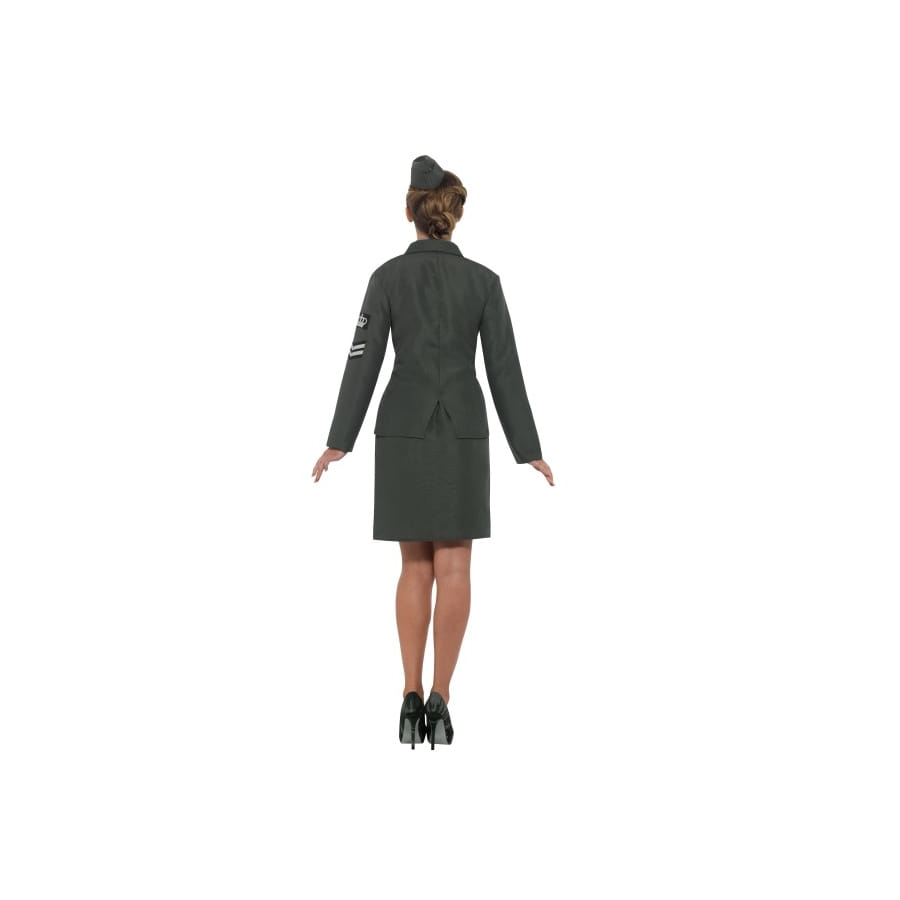 La guerre est certes terminée, mais le scénario reste gravé dans les mémoires ! Inspirez-vous du style vestimentaire d'un soldat de la deuxième guerre mondiale pour composer un déguisement authentique. L'uniforme de femme officier 40-45 comporte en premier lieu une fausse chemise de couleur grise avec laquelle vous porterez une cravate vert armée. Par dessus ce vêtement, vous enfilerez une superbe veste vert armée à manches longues. Celle-ci est dotée de poches, de boutons dorés et d'une ceinture à boucle pour ajuster la taille. La jupe est à coupe droite, de la même couleur que la veste. Elle descend jusqu'en dessus des genoux. Il est vivement conseillé de porter une paire de talons hauts pour avoir une allure plus élancée et sexy.