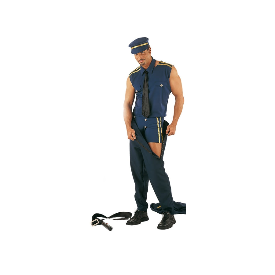 Incarnez ce bel homme sexy en portant cet ensemble constitué d'une veste, d'un pantalon et d'un haut bleu foncé, d'une ceinture, d'un caleçon ainsi que d'une casquette.