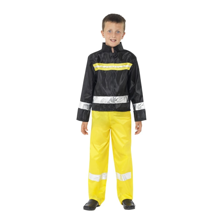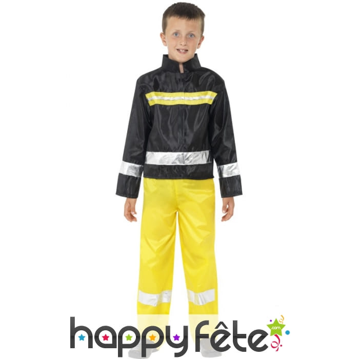 Votre intrépide petit garçon aimerait-il un jour devenir pompier ? Aidez-le dès maintenant à réaliser son rêve ! Combattre le feu, sauver des vies, aller à la rescousse d'une personne en danger nécessitent courage et bravoure, ainsi que tout l'équipement qui va avec. Cet uniforme de pompier est l'attirail indispensable pour s’entraîner à devenir un jour un héros de la ville. L'ensemble est formé d'une veste noire décorée par une bande jaune et une bande grise. Le pantalon jaune présente lui aussi une bande grise. Le tout est disponible en taille L (10-12 ans), M (7-9 ans) et S (4-6 ans). Vous pouvez lui donner un casque jaune pour soigner l'ensemble. Ça y est, votre fils est prêt à vivre une expérience inoubliable, il va s'amuser à exercer l'un des plus beaux métiers du monde.
