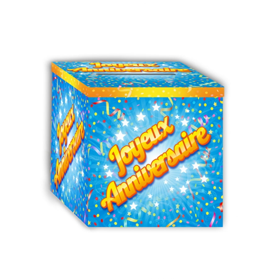 Les mots "Joyeux Anniversaire" sont inscrits en lettres dorées sur toutes les faces de l'urne.
