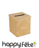 Cette urne en carton kraft mesure 21 x 25 cm et arbore un design élégant et sobre. Le mot "merci" est inscrit en doré sur la partie avant, entouré d'un joli losange aux côtés dorés. Le dessus de l'urne est équipé d'un couvercle avec une ouverture pour permettre à vos invités de glisser ce qu'ils souhaitent à l'intérieur.