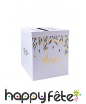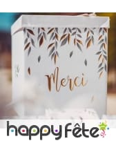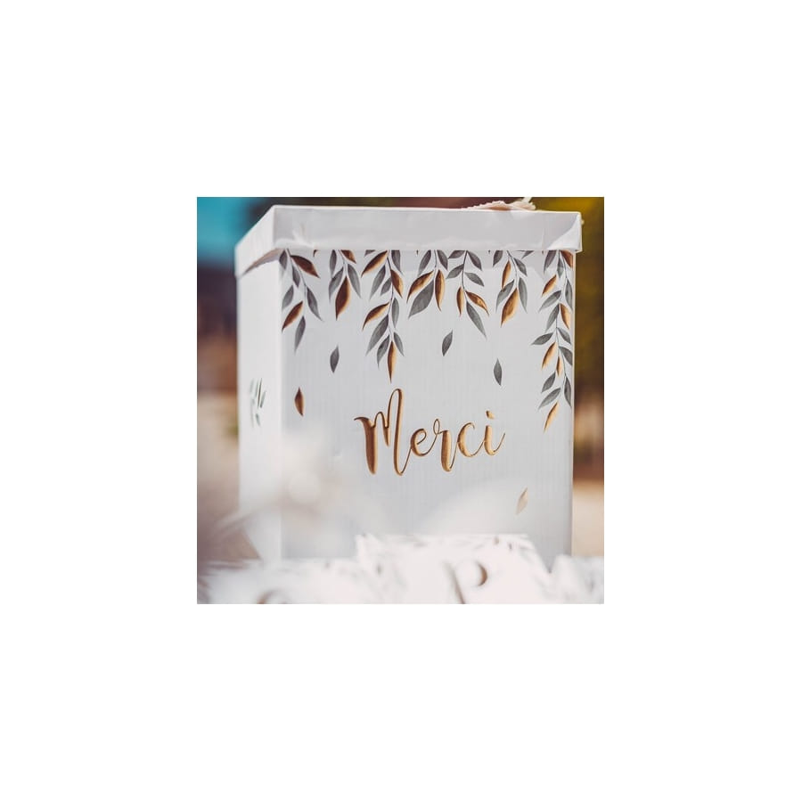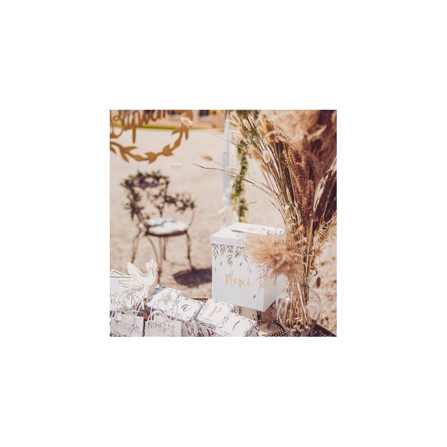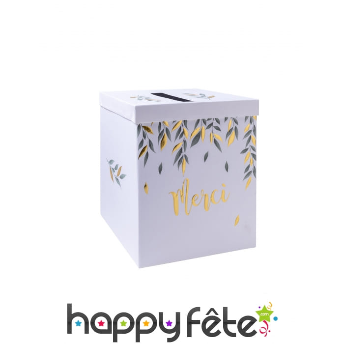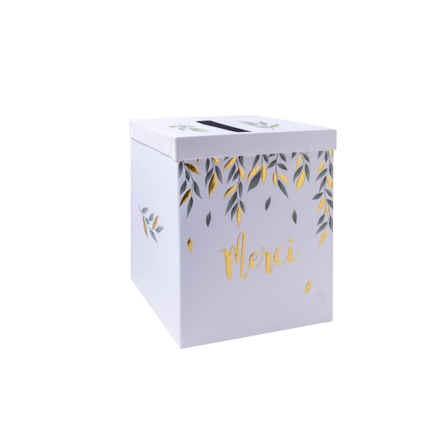 Optez pour une déco dans l'air du temps à l'occasion d'une naissance, d'un mariage ou d'un anniversaire, avec l'urne Merci blanche décorée de feuilles or et vert.