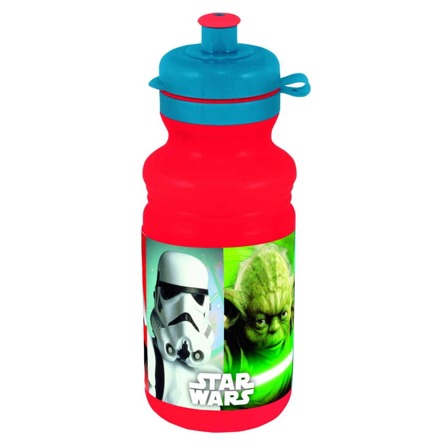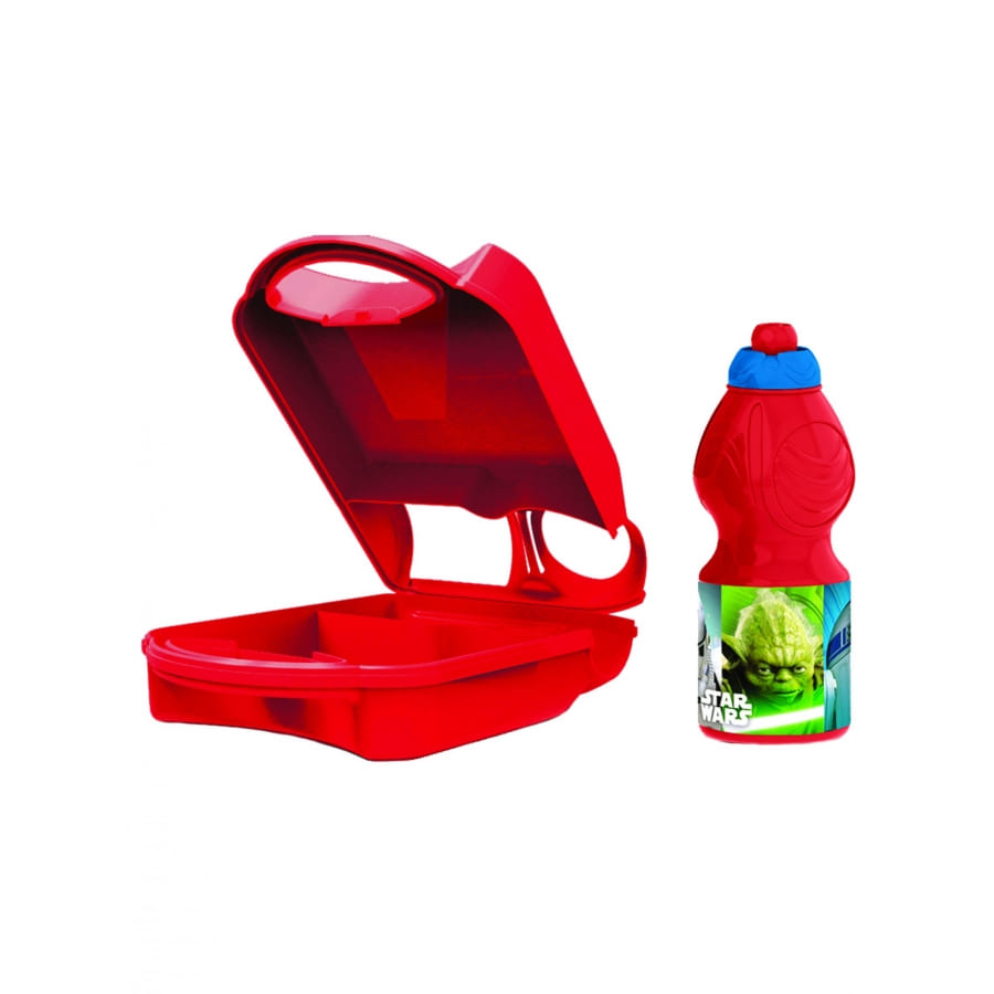 - 1 boîte à goûter rouge refermable et une gourde rouge avec imprimé Star Wars.