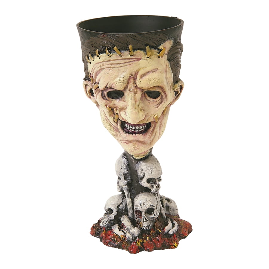 Inspirée de la série de films "Massacre à la tronçonneuse", objet de décoration : verre de massacre à la tronçonneuse. Ce verre, de couleur beige, représente le visage du tueur dans le film, Leatherface, et le pied du verre est orné de nombreuses têtes de mort. Ce verre sera idéal pour décorer votre table de fête à l'occasion d'Halloween, d'une soirée Horreur ou Cinéma.