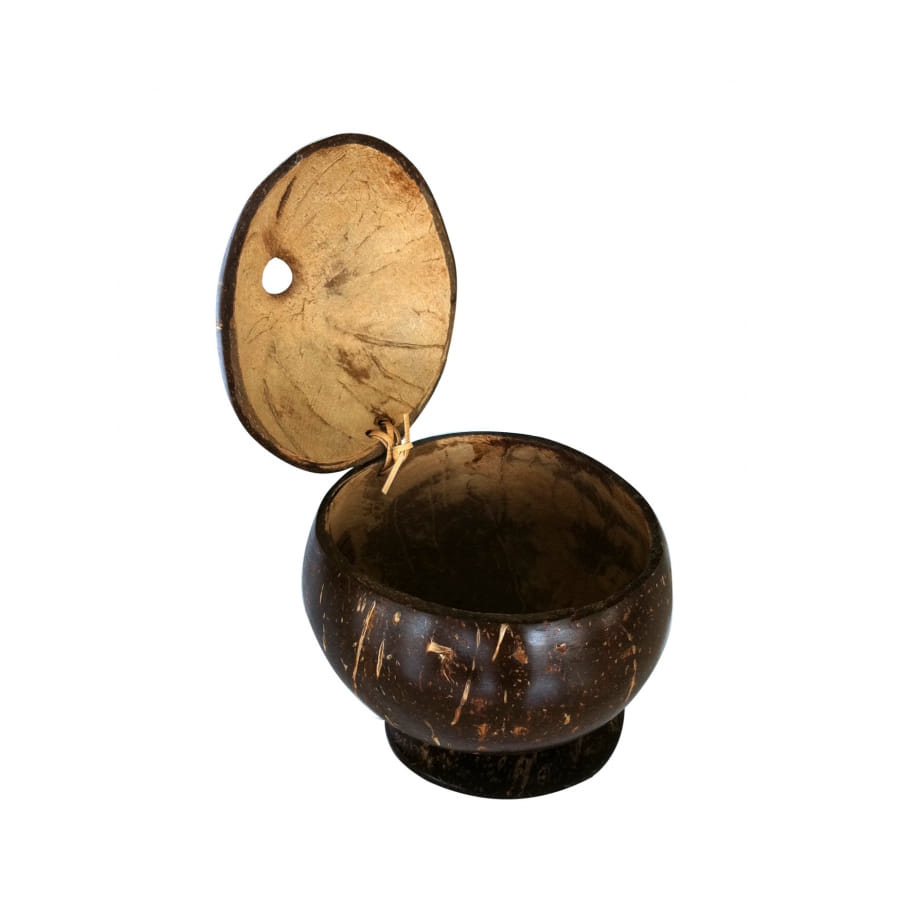 Ce récipient atypique prend la forme d'une noix de coco de couleur marron.