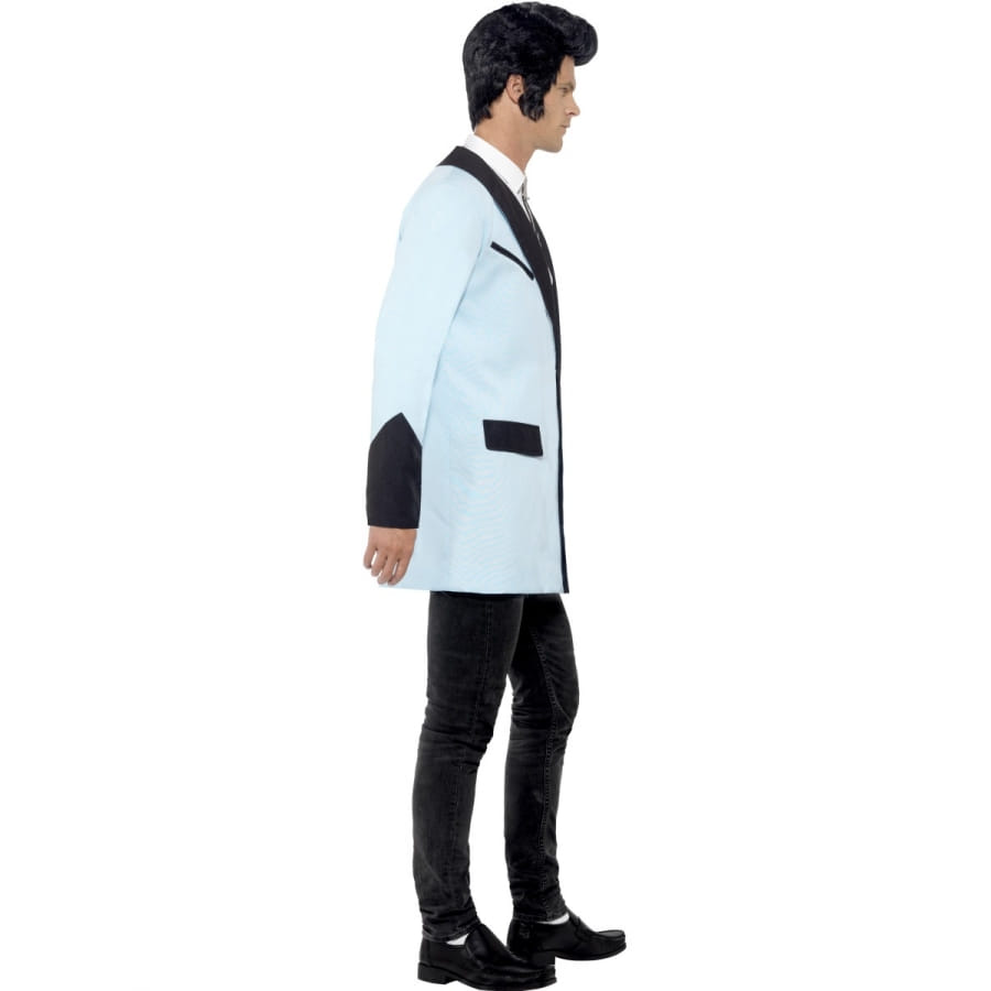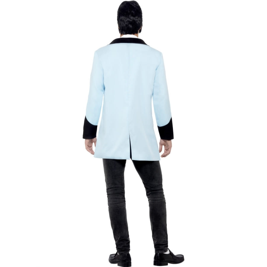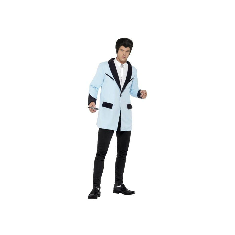 Les Teddy Boys sont des jeunes Anglais, pour la plupart fans de rock'n roll, dont le style vestimentaire s'inspirait du style édouardien. Nous proposons ici cette veste de Teddy Boy que vous pourrez mettre lors d'une fête dont le thème est rock'n roll. Cette longue veste est de couleur bleue claire avec une encolure, des poches et le bout des manches de couleur noire. Les tailles proposées sont L, M et XL.