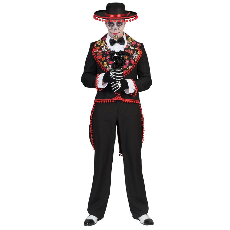 Cet ensemble est constitué d'une veste noire en queue de pie avec lisière bordée de pompons de couleur rouge et d'un col large assorti des têtes de mort colorées.