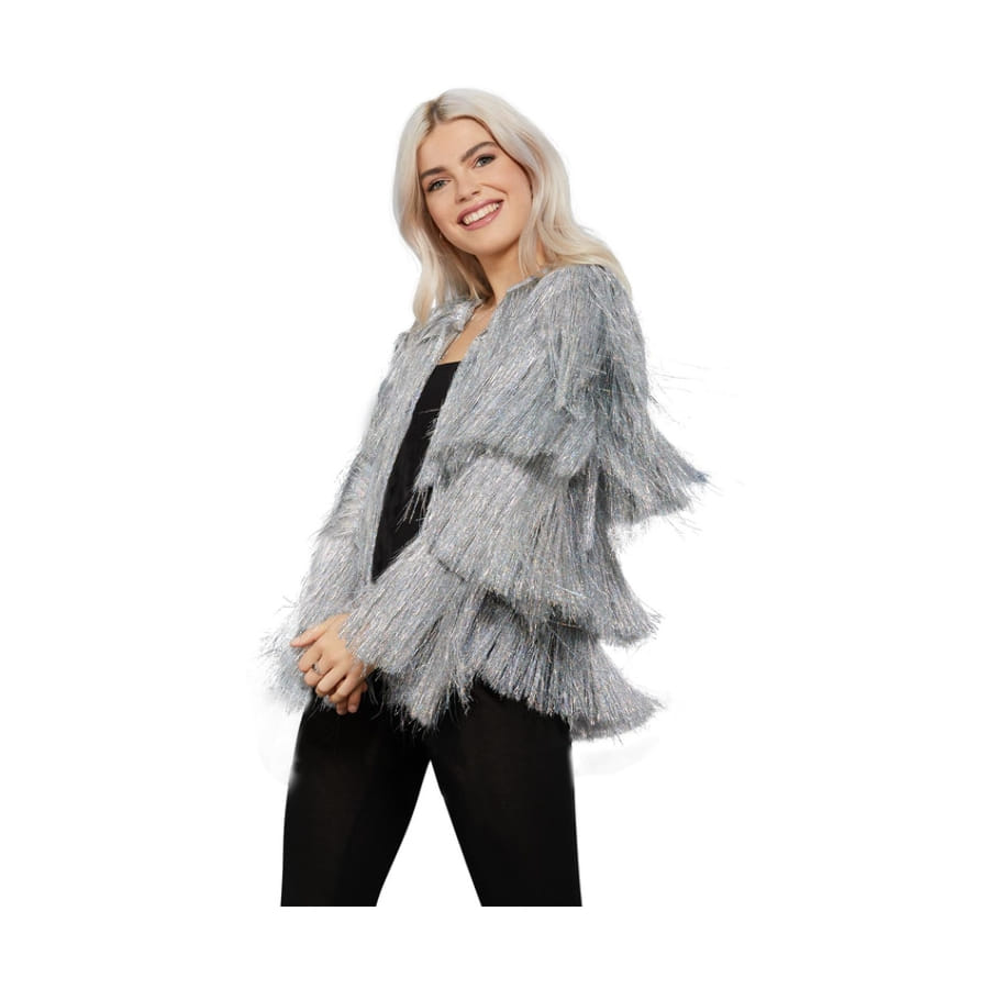 Osez le look diva des années 70 avec la veste disco argentée à franges pour femme.