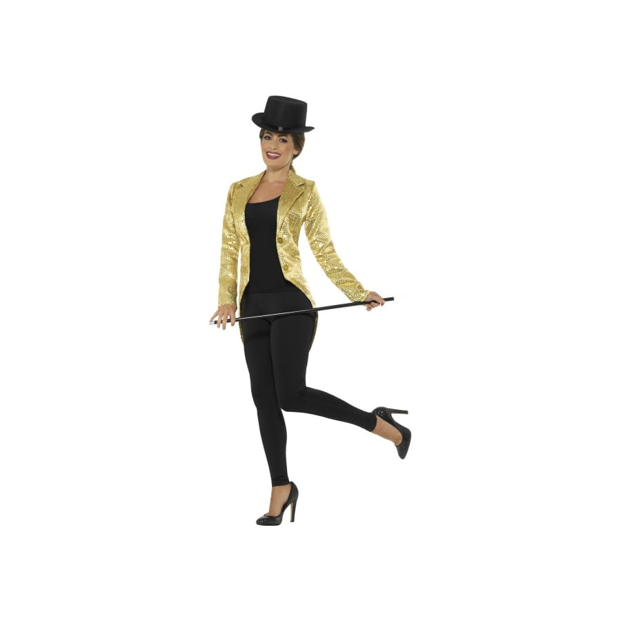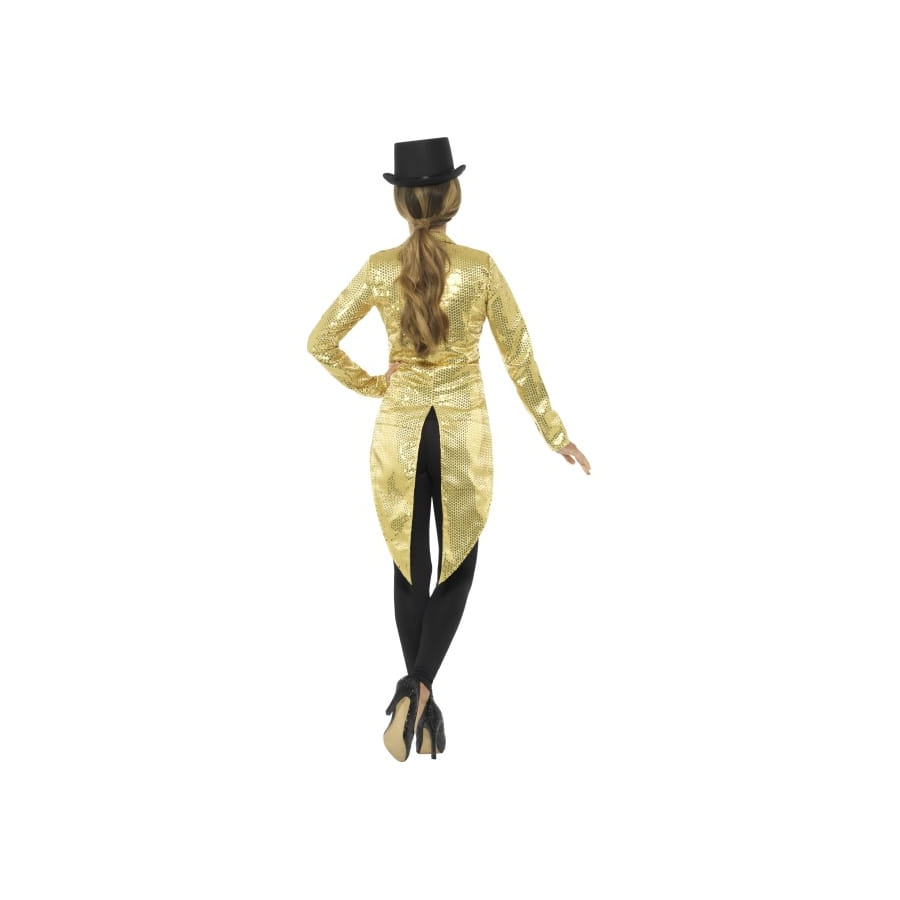 Si vous aimez les paillettes et que vous cherchez une tenue pour votre prochaine soirée à thème Disco, nous vous suggérons cette veste queue de pie sequins dorés pour femme. La queue de pie, à l'arrière, est à fente et longe les cuisses jusqu'au niveau des genoux. Vous pouvez laisser la veste ouverte ou fermée selon votre style.