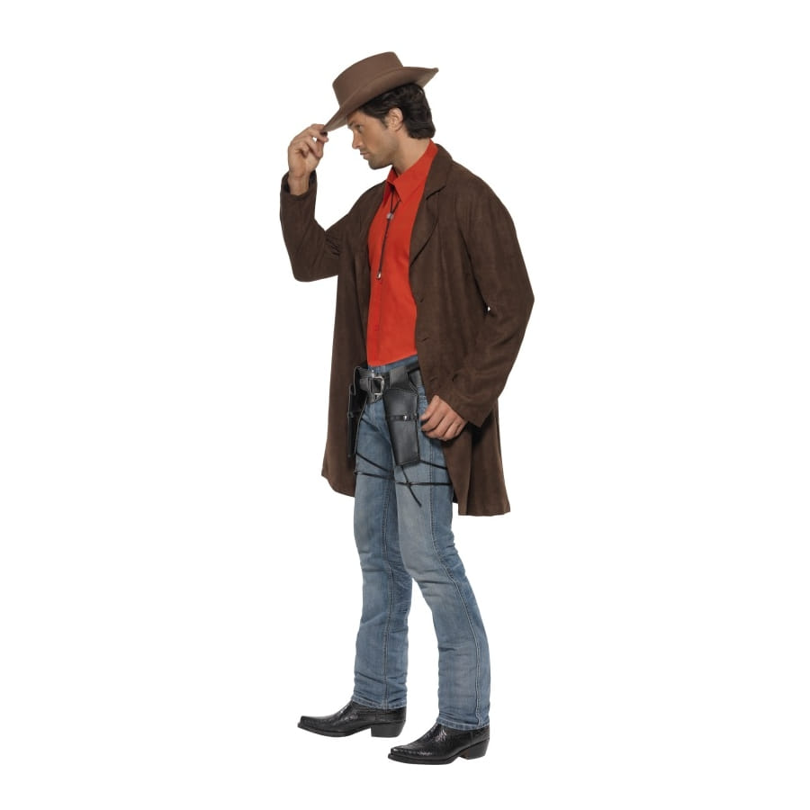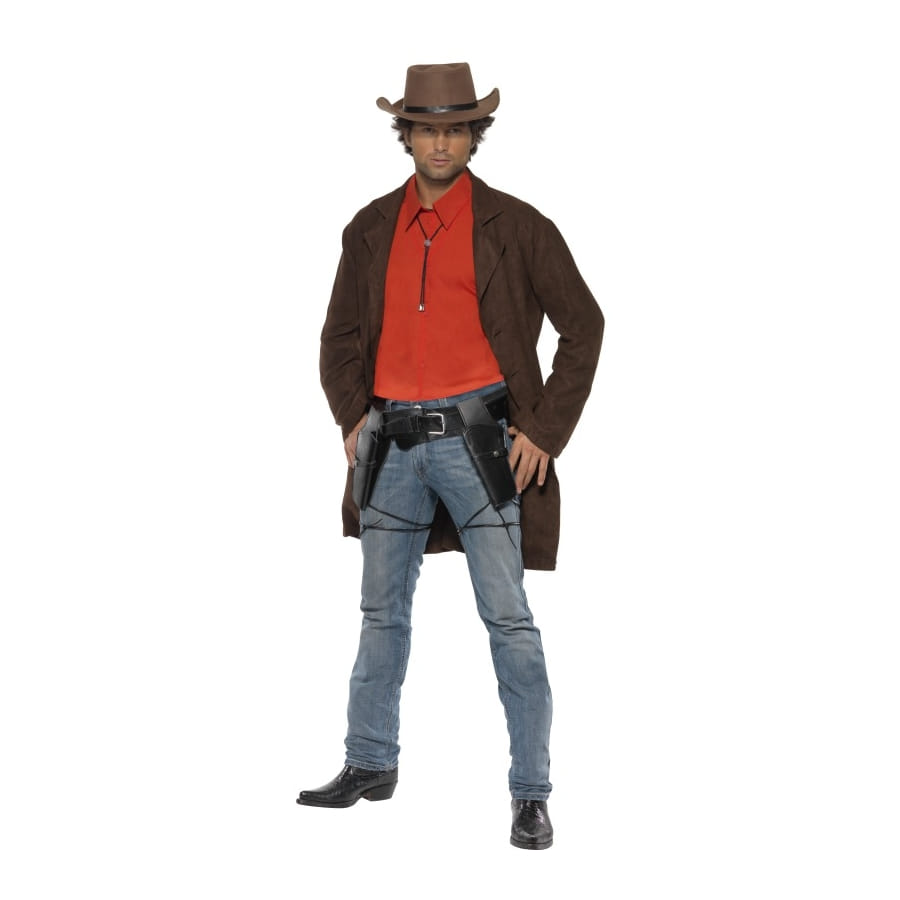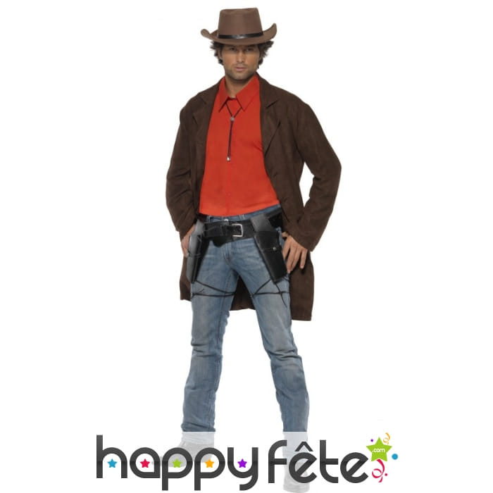 Veste de cowboy, de couleur noire, marron et rouge, avec lacet, pour homme. Cette magnifique veste fera de vous un hors-la-loi dans un univers de Western ou vous pouvez également vous transformer en shériff pour faire régner l'ordre dans l'Ouest.