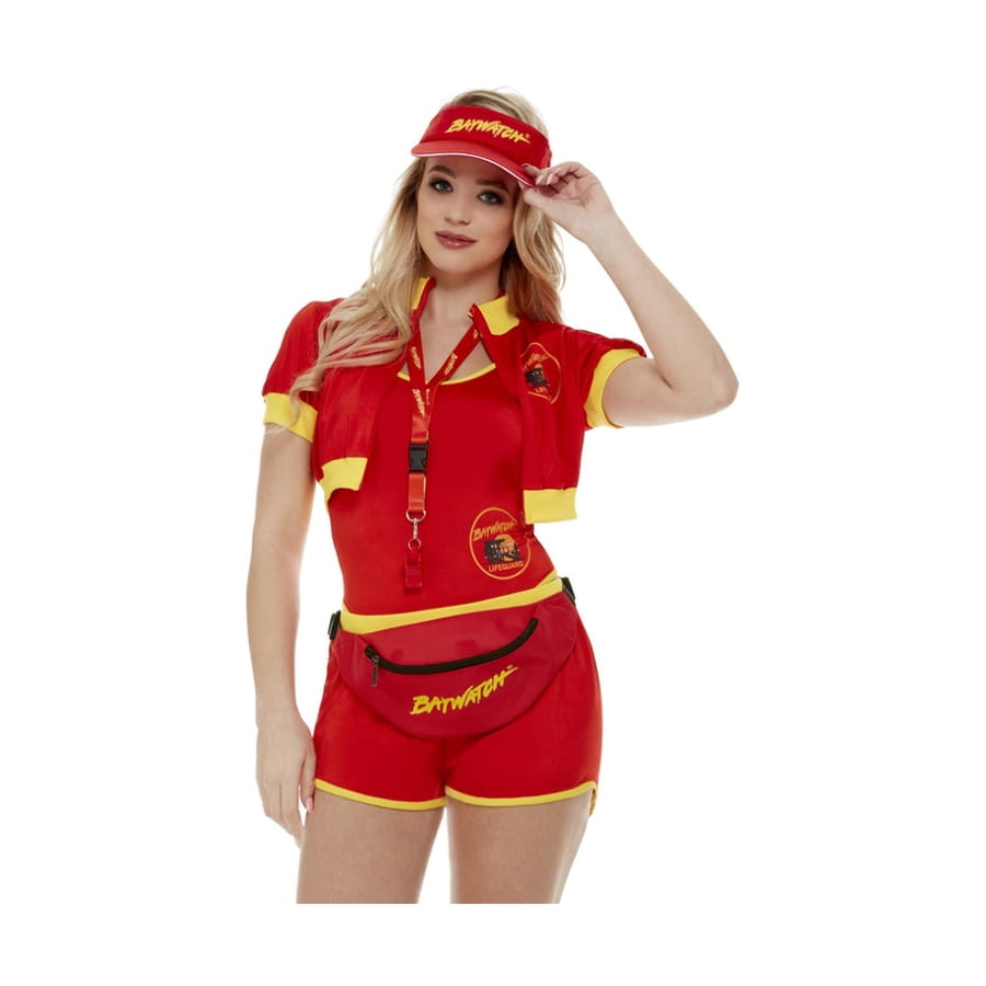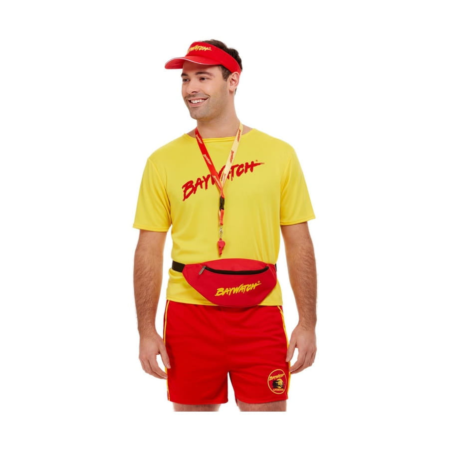 La visière, la banane et le sifflet sont rouges avec "Baywatch" écrit en lettres jaunes.