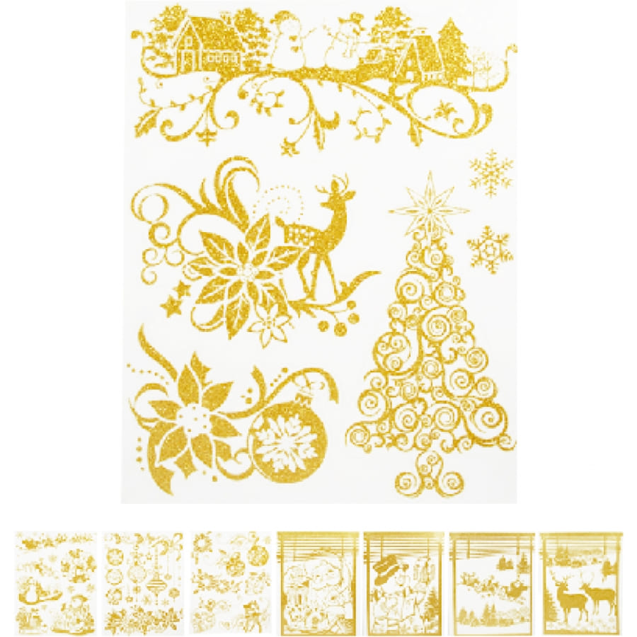 Vitro-statique de Noël entièrement en paillettes dorées. Cet accessoire mesure 30 centimètres de large et 42 centimètres de hauteur. Il existe 8 modèles, mais au moment de la commande vous ne pourrez le choisir vous-même; vous recevrez un des modèles présentés. Créez une ambiance magique partout chez vous en les collant sur vos fenêtres et portes.