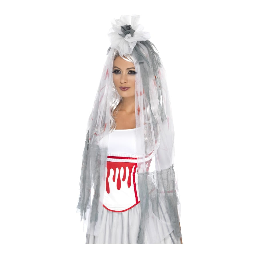 Voile de couleur blanche et grise pour femme. Cet accessoire en mousseline est orné d'une fleur grise et blanche sur le haut et de tâches de sang éparpillées dessus. Vous serez parfait en tant que jeune mariée zombie à l'occasion d'Halloween avec cet accessoire.