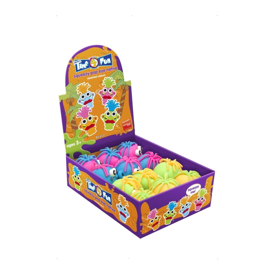 Yeux à presser aux couleurs assorties, vendus en boîte de 12. Il faut que vous pressier sur ces petits personnages afin de faire sortir leurs yeux. Ils sont bleus et roses ou jaunes et verts. Ils ne conviennent pas aux enfants de moins de 3 ans.