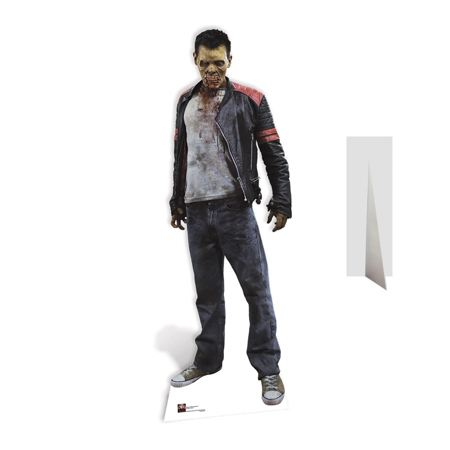 Vous allez sûrement compléter vos décorations d'Halloween avec cette silhouette des que vous verrez ce zombie walking dead de taille réelle en carton. En effet, cette silhouette représente un des zombies de walkingdead avec un visage défiguré, portant un blouson noir et rouge, un haut gris et un jean bleu. Le tout est sous licence Walkingdead.